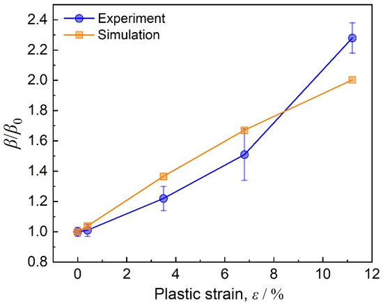 The normalized relative nonlinearity parameters of the plastically deformed specimens with respect to the ultrasonic nonlinear parameters β0 of the original unstretched specimens were defined as a function of the plastic strain. The results from experimental measurement and finite element simulation are shown in Figure 8.