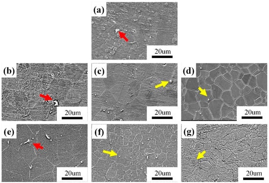The SEM of the as-extruded and ECAP-ed 0.6 wt.% MgO/Mg–3Zn–0.2Ca composite is shown in Figure 2, and the specific grain size is shown in Table 1. The average grain size and standard deviation were obtained through EBSD analysis. Figure 2a shows that the grain-size distribution of the as-extruded specimen is not homogenized, presenting the distribution of large grains around small grains. In the ECAP-ed specimens, the distribution of the microstructure was more uniform, and the grains evolved into equiaxial crystals. The significant changes in microstructure can be explained by the following aspects. The processing temperature is kept at 300 °C to reach the recrystallization temperature of Mg alloy during the ECAP process and the deformed grains recover and recrystallize, resulting in grain refinement. Nevertheless, the specimens are also subjected to strain along with the recrystallization process, such that the mechanical shearing effect breaks coarse grains into refined ones. Mechanical actions, such as shear stress concentration during extrusion, induce lattice twisting at grain boundaries, leading to the formation of high-angle grain boundaries and grain refinement. Dislocation accumulation and cross-slip contribute to a banded structure. As stress increases, sub-grain boundaries form and migrate, further promoting the development of high-angle grain boundaries and finer grains. Magnesium alloys have a low stacking fault energy (SFE), making it difficult for dislocations on slip planes to rearrange through climb and cross-slip. As a result, during hot deformation, the dynamic recovery process in magnesium alloys is relatively slow, causing local dislocation density to increase with strain, which consequently promotes the initiation of dynamic recrystallization [,].
