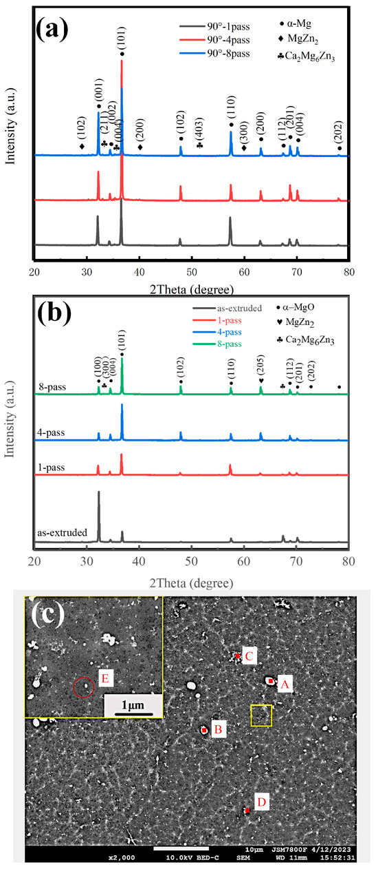 The flocculent second phase (as indicated by the red arrow) appears in the grain boundary, and the spherical second phase (as indicated by the yellow arrow) appears inside the grains, as shown in Figure 2. Table 2 shows the EDS result of the four-pass ECAP-ed specimen marked in Figure 3c. Through energy spectrum analysis and the XRD phase analysis results, it can be seen that the atomic ratio Mg:Ca:Zn is close to 6:2:3; therefore, it can be considered that the second phase at the grain boundary (A and B) are Ca2Mg6Zn3 molecules. Similarly, the flocculent second phases (C and D) are marked as MgZn compounds. The white particles at position E are identified as MgO, and it can be seen that the atomic percentage of Mg and O elements in Table 2 is not 1, because the size of the MgO particles is so small that the Mg matrix will be scanned in point scanning, resulting in a higher content of the Mg element.