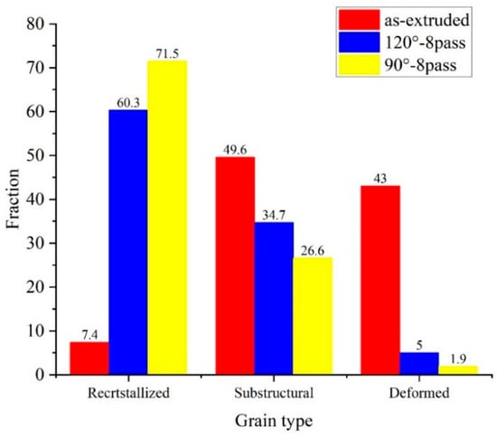 Figure 4 shows the fraction content of grain type of the specimens. The as-extruded specimen exhibits a typical deformed structure; the fraction of recrystallized grain is just 7.4%, and most of the grains are substructure and deformed grains; the scale of substructure and deformed grains is close to 1:1, while in the ECAP-ed specimen, after eight passes at 120°, the recrystallized grains increase to 60.3%, and the fraction of deformed grains is 5.0%, which indicates an improvement in recrystallization. However, the grains have completed recrystallization in the ECAP-ed specimen after eight passes at 90°, almost no deformed grains are left, and the recrystallized grain is up to 71.5%. The main difference in eight-pass ECAP-ed specimens at different angles lies in the proportion of recrystallized grains and subgrains. In addition, the proportion of recrystallized grains in samples subjected to ECAP at 90° is higher because the ECAP-ed specimen at 90° obtains greater heterogeneity of the distribution of the stored energy in neighboring crystallites, which acts as a driving force for recrystallization during the recrystallization process, promoting its recrystallization behavior.