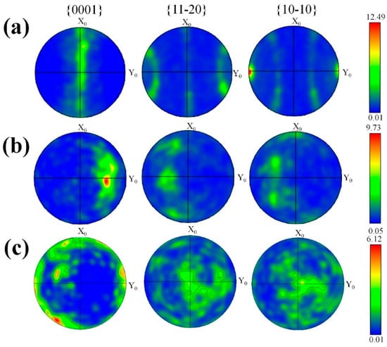 Figure 5 presents the pole figures of the as-extruded and eight-pass ECAP-ed 0.6 wt.% MgO composite. The fabric texture {0001} <1010> in the as-extruded specimen indicates that the {0001} basal plane and <10–10> direction of most grains are parallel to the extrusion direction (ED), as shown in Figure 5a. The strong basal plane orientation of the coarse grains explains that the pole density of the extruded state (12.49) multiple of random distribution (MRD) is higher than that of the ECAP-ed specimens, indicating that the basal texture decreases after ECAP. The prismatic surface slip is the major deformation mechanism due to the equivalent axisymmetric compressive stress of extrusion and the axial tensile stress, while the {0001} basis plane is parallel to the c-axis direction, and {10–12} tensile twinning occurs when the plane is compressed or stretched along the c-axis direction. The research shows the {0001} basal texture is decomposed into {10–10} and {2-1–10} textures with the increase in the extent of compressive deformation, resulting in texture softening, which can decrease the yield strength []. Figure 5c presents the pole diagram of the composite after eight-pass ECAP. After the specimen is processed by eight-pass ECAP at 90°, it is subjected to strong shear force from passing through the included angle, and the basal plane slip system is activated to form a {11–20} <0001> texture; that is, the (0001) basal plane has a vertical oblique texture in the theoretical shear plane. The strong point in the pole figure is rotated about 70° counterclockwise around the ED direction, deviating from the orientation position of the basal plane and significantly weakening the basal plane texture. It is known that the rigid rotation of the lattice is 45° during the ECAP deformation at φ1 = 90°; however, the rotation of the lattice after eight passes is significantly larger than this angle, indicating the rotation of the lattice is not limited to the rotation of the crystal. In the early stage of deformation, strong shear deformation occurred during the ECAP process, and the coarse grains were broken to form cell blocks which rotated to match the strain between adjacent cell blocks to form a new texture. The grains had been refined, and the texture evolution in the grains was mainly formed by the rotation of the whole grains in the later stage of deformation, thereby gradually forming the ECAP shear texture.