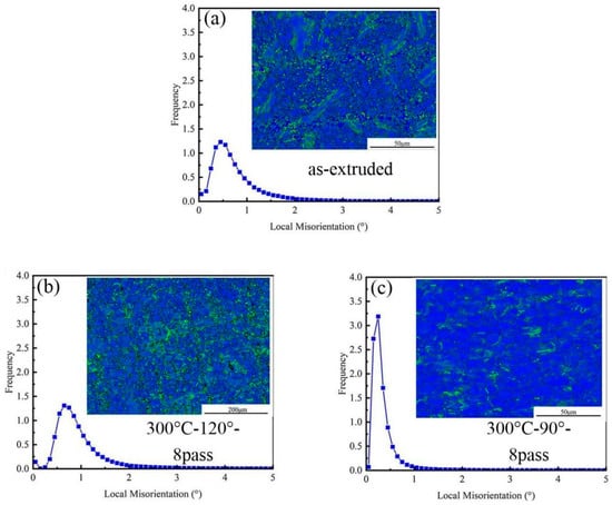 Kernel average misorientation and local misorientation of specimens. (a) As-extruded, (b) 8-pass ECAP at 120°, and (c) 8-pass ECAP at 90°.