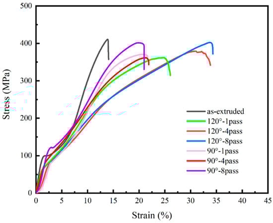 There is an interesting phenomenon in Figure 7, which is that the yield strength of the alloy processed by high number of ECAP passes has no obvious change, although the grain size is refined. This phenomenon can be explained by the following aspects. After ECAP processing, there are still large grains in the material structure, which is not the complete grain refinement in the strict sense, and the phenomenon of uneven grain size appears. The preferred orientation of texture affects the mechanical properties of magnesium alloys []. Studies have shown that the elongation of the extruded magnesium alloy is greatly improved after equal channel angular extrusion, but the strength has not changed significantly, which is consistent with the findings of []. The compressive yield strength (CYS) has different performances at 90° and 120° after eight-pass ECAP; in the ECAP-ed specimens at 90°, the CYS increases with the increase in number of passes because of the effect of grain refinement, verified by the Hall–Petch effect. But it has the opposite trend in the ECAP-ed specimen at 120°; overall, it is in a relatively balanced state with a small downward trend, which is related to the texture softening effect; in the ECAP-ed specimen at 120°, the specimen is prone to form a basal fiber texture during the deformation processes, the {0001} basal plane is parallel to the c-axis direction, and {10–12} tensile twinning can occur when compressing or stretching along the c-axis direction. The {0001} basal texture is decomposed into {1010} and {2-1–10} textures with the increase in the degree of compressive deformation, resulting in texture softening, then a reduction in the CYS.