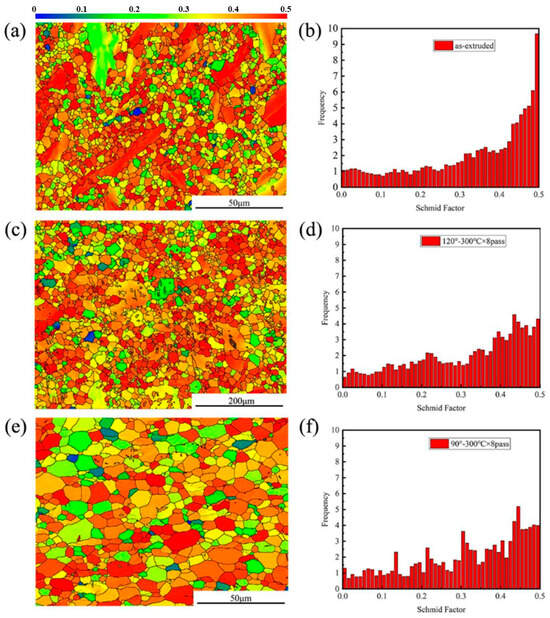 Schmid factor of different specimens. (a,b) As-extruded, (c,d) 8-pass ECAP at 120° and (e,f) 8-pass ECAP at 90°.