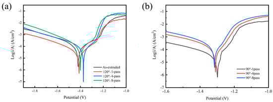 Dynamic potential polarization curves of composites. (a) As-extruded and 1-, 4-, 8-pass ECAP at 120°, and (b) 1-, 4-, 8-pass ECAP at 90°.