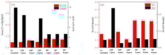 Electrochemical parameters for different specimens in SBF solution. (a) Corrosion potential and corrosion current density of extruded and ECAP-ed specimens, and (b) cathode Tafel slope and anode Tafel slope of extruded and ECAP-ed specimens.