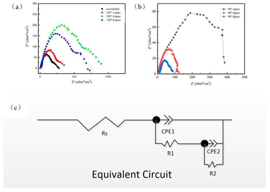 Impedance spectroscopy of composites. (a) As-extruded and 1,4,8-pass ECAP at 120°; and (b) 1,4,8-pass ECAP at 90°; (c) Equivalent circuit model of specimens under corrosion in SBF Solution.