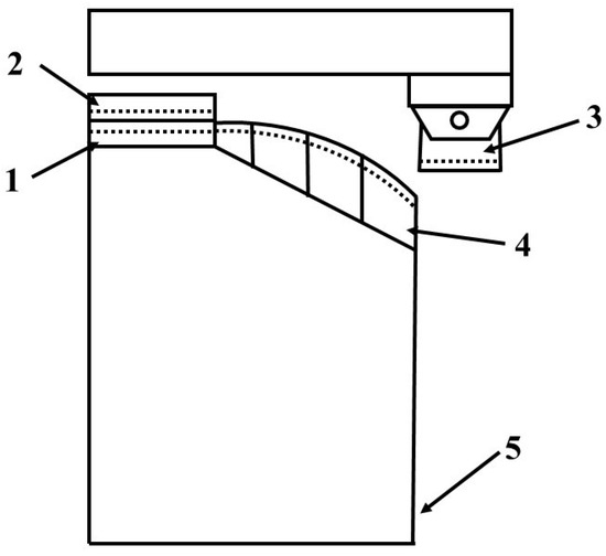 For the aforementioned 7075 aluminum alloy pipe, a follow-die bending mold was used for the bending process (Liaoning Zhongwang Group Co., Ltd., Liaoyang, China). The schematic diagram of the bending mold is shown in Figure 1, which details components 1 through 5. During the bending experiment, the pipe is first secured between the lower pipe clamping die (1) and the upper pipe clamping die (2) to ensure stability during the bending process. Subsequently, the upper bending die (3) and the lower bending die (4) apply pressure to the pipe from both the top and bottom directions, causing it to bend. The lower die support frame (5) provides the necessary support for the entire bending process, ensuring the stability of the mold.