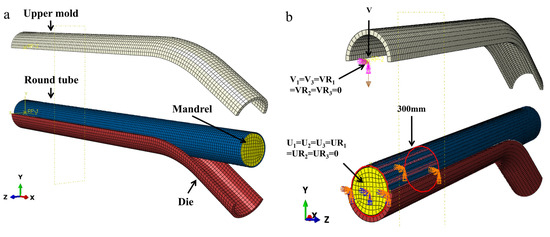 Considering the complexity of the tube bending and springback process, a dual-algorithm strategy was adopted for the tube pressing–bending and springback process, divided into two analysis steps, to fully leverage the advantages of both algorithms. During the pressing–bending phase, the dynamic explicit algorithm is used to simulate the rapid deformation process of this stage. Specifically, the lower die is fixed while the upper die is given a velocity to simulate the pressing action. After the pressing–bending is completed, the analysis switches to a steady-state analysis. At this point, the system has transitioned from dynamic loading to a relatively stable deformation phase, and steady-state analysis can simulate the springback process more efficiently, ensuring simulation accuracy while significantly reducing computation time. To replicate real-world working conditions, the unbent end of the pipe is fixed with a 300 mm length, and the mandrel is constrained to the same side of the end face to ensure the pipe’s stability during the bending process. The complete loading and boundary conditions are illustrated in Figure 2b.