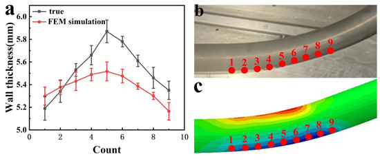 (a) Comparison of wall thickness between FEM simulation and experimental measurements. (b) Experimentally measured wall thickness measurement position. (c) Finite element simulation wall thickness measurement position.