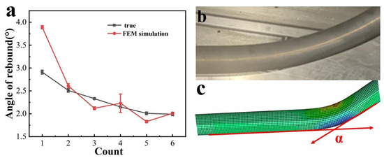 (a) Comparison of the springback angle between FEM simulation and experimental measurements. (b) Experimentally measured springback angle. (c) Finite element simulation springback angle.