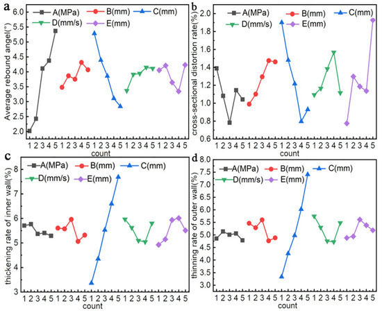 Table 3 shows the results of the orthogonal test of the springback angle and the analysis of the orthogonal results. In the intuitive analysis method, the five different factors are judged by the extreme difference R. The larger value of R indicates that the factors affect the results to a greater extent. k represents the degree of influence of each level on the evaluation index of the test, and it is used to analyze the optimal combination scheme among the horizontal factor levels. From the data in the table, it can be seen that the factors affect the springback angle in the following order of precedence: A (material properties) > C (pipe diameter)> E (clearance) > B (wall thickness) > D (speed). Based on the results of the analysis, the optimum horizontal factor combination of the factors affecting the springback angle is derived as A1C5E4B1D1. That is, the material properties are the yield strength 225 MPa of the 7075 aluminum alloy pipe in the W state obtained under the condition of heating at 475 °C for 5 min; the diameter of the pipe is 60 mm, the clearance between the mandrel and the pipe is 0.4 mm, the wall thickness is 3 mm, and the speed is 30 mm/s. The trend curves of the springback angle, cross-section distortion rate, outer wall thinning rate, and inner wall thickening rate under different parameter combinations in orthogonal tests are shown in Figure 5. According to the steepness and flatness of the curve, it can be more intuitive to determine the primary and secondary factors, as well as the change in the factor indicators of the changes in their bending and forming law.