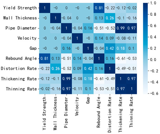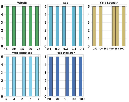 The dataset is the result generated by finite element simulation, which is the same as the dataset used in the orthogonal test analysis in the previous paper, and the dataset is divided into two parts: the training set and the test set. The training set consists of 25 samples generated by orthogonal tests, and the test set consists of 60 samples generated by random sampling, with five key features recorded in each sample set: yield strength, wall thickness, pipe diameter, speed, and clearance; three intermediate test results: distortion rate, thickening rate, and thinning rate; and the final prediction of the target bending springback angle of the test for the 7075 aluminum alloy pipe. After the orthogonal test screening, each feature covered different values and was evenly distributed, and the sample size is shown in Figure 6. In the twenty-five samples, each feature has five different values, and there are five samples for each value, so the distribution of all features is uniform. The feature correlation matrix is shown in Figure 7. In the figure, it can be seen that the springback angle has a strong positive correlation with the yield strength and a more obvious negative correlation with the pipe diameter, and the remaining three features have a relatively low correlation with the springback angle. In addition, according to the feature correlation matrix, it can be seen that the correlation between two features is close to 0 or equal to 0, which can show that the orthogonal test is effective for screening the values of the features. Figure 8 shows the distribution of springback angle values, and Figure 9 shows a schematic diagram of the springback angle distribution, where the dark blue area is the kernel function density curve, cyan is the sample distribution frequency histogram, and orange is the mean value. The figure shows that the distribution of the range of values of the springback angle in the training set is relatively uniform, which can cover most of the cases of the springback angle. In Figure 9, it can be seen that the distribution of the springback angle is different between the training set and the test set, which can also better validate the performance of the model as well as its generalization ability and test whether the model is biased in the fitting process.