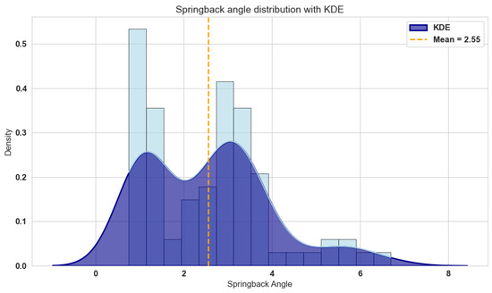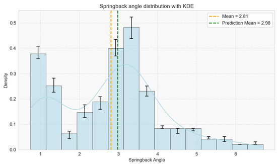 The error analysis between the true rebound angle and the predicted value is shown in Figure 17. The ordinate represents the number of samples corresponding to the rebound value, and the upper and lower black horizontal lines represent the maximum and minimum values of the distribution of sample values predicted by the model in the process of repeating five random trials. It can be seen that the region with a small springback angle fluctuates to some extent with the distribution difference of the true sample, while in the region with a large rebound angle, the distribution is relatively stable with only a few prediction error distributions. Therefore, there is uncertainty in the prediction of the proposed model when the springback angle is small, but the uncertainty and prediction error are both low in the part of the springback angle greater than 3 degrees.