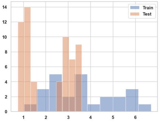In this experiment, since the training set of the finite element test obtained from the orthogonal test has only 25 samples, an unsupervised data enhancement method is used to generate new samples by averaging the eigenvalues of the different samples. According to the empirical values set, the sample number is randomly generated between 2 and 5; each time, the non-return sampling takes the average value as the new sample after taking a random number of samples. Since there are 60 samples in the test set and 25 samples in the training set, 35 fusion samples are generated by data enhancement. The distribution of the springback angle after data enhancement is shown in Figure 10. The enhanced data increases the distribution of the springback angle between 3 and 5, which enriches the input spatial distribution of the training set and improves the generalization of the dataset.