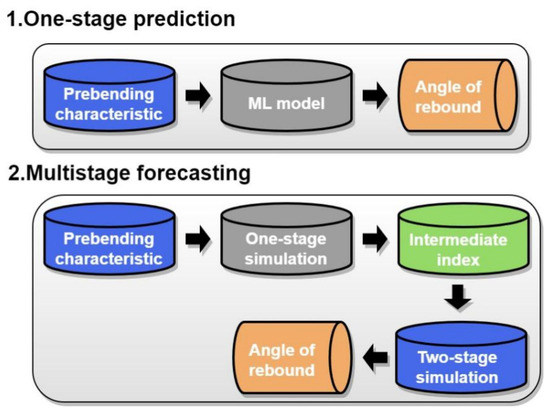 Multi-stage forecasting is a hierarchical step-by-step approach to forecasting and is shown schematically in Figure 11. It approaches the final prediction goal gradually through multiple stages of prediction, each using the previous stage’s output as input. This method is often used to deal with complex problems, especially when it is difficult to predict the final goal directly or when there is a hierarchical relationship between the data. This approach allows the complex prediction task to be broken down into multiple smaller, relatively independent prediction tasks, with each stage focusing on predicting an intermediate variable or feature. Each stage can use a different model and feature set to gradually improve the accuracy of the final target’s prediction. In this paper’s 7075 aluminum alloy pipe bending springback scenario, the cross-section distortion rate, thickening rate, and thinning rate are key factors that directly affect the forming quality. By accurately predicting these parameters, the springback angle can be predicted and controlled more effectively, so the task of predicting the springback angle can be decomposed into two parts. The first part of the task predicts the intermediate indexes of the distortion rate, thickening rate, and thinning rate, and the second phase of the task combines the three intermediate indexes obtained by prediction and jointly predicts the final prediction target springback angle.