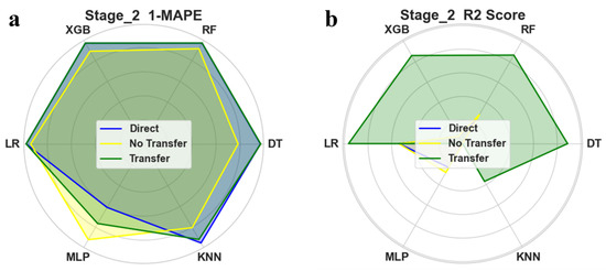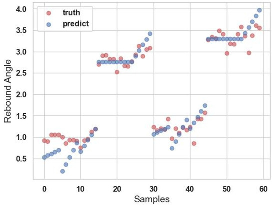 To visualize the performance improvement achieved by transfer learning, the results are presented as radar charts in Figure 16a,b. For clarity, the MAPE is converted to 1-MAPE, representing the proximity to the true value. Since the MAE and MAPE are highly correlated, only the MAPE and R2 results are shown. In order to show the effectiveness of the proposed method, we also compare the results in other papers on rebound angle prediction models, as shown in Table 7. Since the evaluation metrics adopted by each paper are different, only their corresponding metrics are shown. As can be seen in the table, the proposed method is significantly better than the methods in other papers, and the performance of rebound angle prediction is significantly improved.
