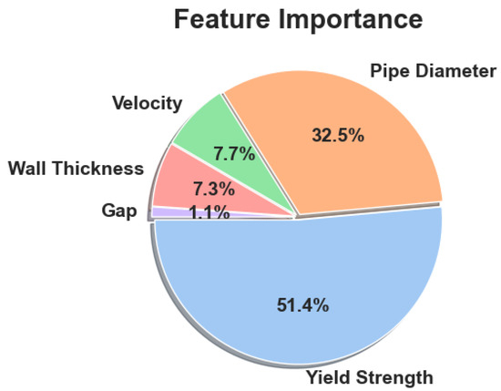 All the default parameters are used for the first stage prediction. It can be seen that linear regression has the best-fitting effect, and the comparison between the predicted values and the true values in the specific test set is shown in Figure 12, where the horizontal coordinates represent the samples. The vertical coordinates represent the springback angle. The distribution of the predicted and true values in the test set is very close to each other, and there is no large deviation, indicating that the linear regression model has the best-fitting effect on this dataset. The importance of the features obtained from the coefficients of the corresponding features of the linear regression model is shown in Figure 13. The material properties and pipe diameter have the greatest impact on the accuracy of predicting the springback angle, which is 51.1% and 31.6%, respectively, and this is consistent with the results in the feature correlation analysis. Since the cross-section distortion rate, thickening rate, thinning rate, and other indicators are indicators that will continue to change with the bending process of the 7075 aluminum alloy pipe, which has a certain correlation with the change in the springback angle, the task of predicting the springback angle is divided into a two-stage task. In the first stage, the intermediate variables are predicted first. The predicted intermediate variables with the input features are fed into the prediction model in the second stage, and finally, the springback angle is predicted. In the second-stage prediction model, the input features of the first-stage model are the same as those in the first-stage prediction. The gap, wall thickness, speed, pipe diameter, and yield strength features are inputted. Still, the first-stage model’s prediction target differs from the first-stage prediction. The prediction target is the distortion rate, the thickening rate, and the thinning rate, which directly affect the springback angle, i.e., the input dimension is 5 and the output dimension is 3. After the prediction is obtained, the distortion rate, thickening rate, and thinning rate are combined with the five features inputted from the first-stage prediction model into the second-stage prediction model, and the prediction target is the springback angle, i.e., the input dimension is 8 and the output dimension is 1. The task of springback angle prediction is split into two subtasks using multi-stage prediction. Task one is to predict the distortion, thickening, and thinning rates by inputting the gap, wall thickness, speed, tube diameter, and yield strength. Task two is to input the input gap, wall thickness, speed, pipe diameter, yield strength distortion rate, thickening rate, and thinning rate and predict the springback angle, and the result is shown in Table 5.