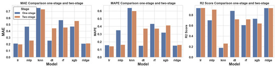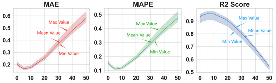 Since SVM and LGBM do not support multi-objective regression, second-stage prediction experiments were not performed. The comparative effect of the experimental metrics is shown in Figure 14. As can be seen in the figure, by splitting the subtask of springback angle prediction into a two-stage prediction task, in addition to the decision tree and XGBoost, all the indicators of the remaining machine learning models have a certain degree of improvement, of which the multilayer perceptual machine and the random forest are the most obvious, and the best-performing linear regression also has a small increase in the performance, which proves that this subtask-splitting method has a significant effect on the improvement of performance. Since there is no tunable parameter for linear regression, the optimization is performed for the ridge regression method with the L2 regularization term added to linear regression. The L2 regularization coefficients are 0.01, 0.02, 0.05, 0.08, 0.1,0.15, 0.2, 0.3, 0.5, 0.8, 1, 2, 5, 10, 20, 30, 40, and 50. The Solver is taken as ‘svd’, ‘cholesky’, ‘saga’, ‘sparse-cg’, ‘lsqr’, and ‘auto’, and the experimental results are shown in Figure 15. In the figure, the X-axis is the L2 regularization coefficient, the solid part of the curve is the average value, and the upper and lower bounds are the maximum and minimum values when the Solver takes different values, respectively. As can be seen in the figure, the optimal regularization coefficient is alpha = 10 when the scores of three evaluation indexes, the MAE, MAPE, and R2, are all optimal, where alpha = 10, MAE = 0.1499, MAPE = 0.0991, and R2 = 0.9669. Compared with the results of the default value before tuning, the MAE improved by 30%, the MAPE enhanced by 39%, and the R2 improved by 3.79%, and it can be seen that parameter tuning has produced a significant enhancement of the model performance.