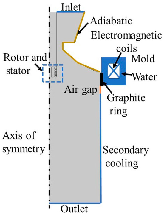 - Khatsayuk, M.; Vinter, E.; Timofeev, V.; Belov, N.; Sergeev, N.; Pervukhin, M. Numerical Simulation of Process of Electromagnetic Casting and Technology Features. Met. Mater. Trans. B 2023, 54, 1768–1783. [Google Scholar] [CrossRef]