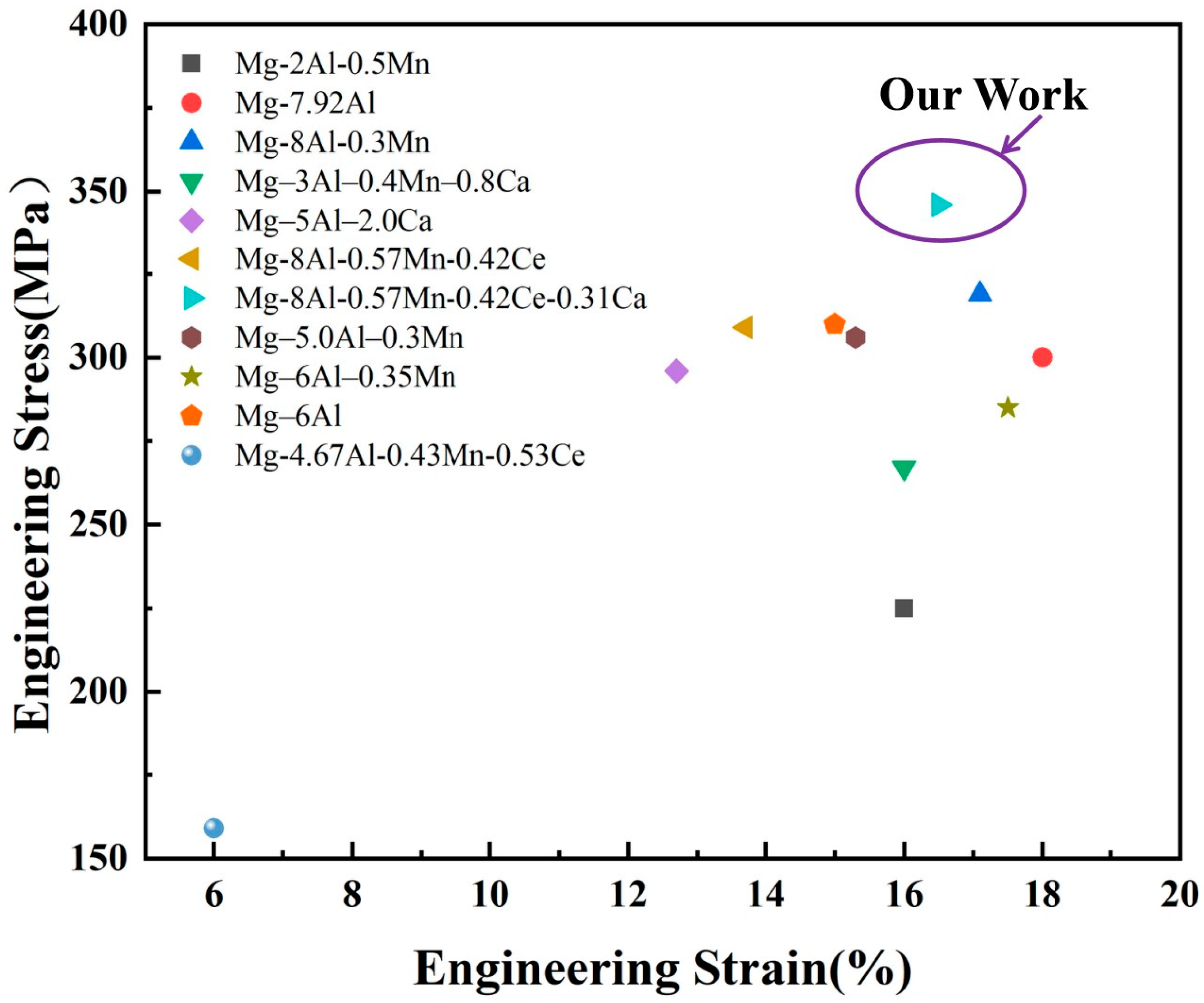 - Through the composition design, high quality Mg-8Al-0.57Mn-0.42Ce-(0.31Ca) alloy profiles were successfully prepared, and a high YS of 190 MPa, UTS of 346 MPa, and high EL of 16% were achieved.
