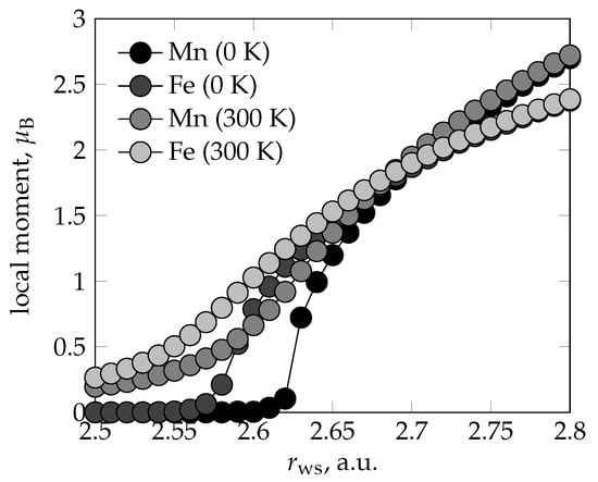 Recent experimental results suggest two ordering temperatures: 93 K, where the system forms a spin glass state, and 38 K, where it becomes FM [19]. Hence, for most applications, it is reasonable to assume a PM state. To model this, the DLM approach was employed. The magnetic contribution to the free energy can have a significant effect and must also be considered [55,56]. This is evident in the behavior of the local magnetic moment as a function of the Wigner–Seitz radius, as shown in Figure 1, where only the Mn and Fe moments are non-zero near equilibrium (∼2.6 a.u.). Including the magnetic contribution to the free energy eliminates the discontinuous jump from a nearly zero Mn moment to a high-spin state for Mn. More importantly, without this contribution, the Mn moment is zero at the equilibrium volume.