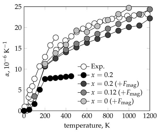 The temperature dependence of is shown in Figure 2 for , , and . The calculated results are compared with existing experimental data for [19,65]. These calculations were carried out for the PM state, both with and without accounting for the magnetic contribution to the free energy. Including the magnetic contribution significantly improves the results, leading to a much better agreement with experimental data above room temperature. The significance of the magnetic contribution to the free energy in determining mechanical properties has been demonstrated in previous studies, such as those of austenitic steels [66,67].