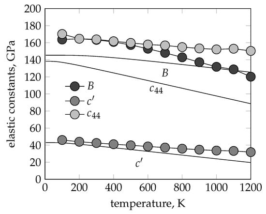 Figure 3 shows the temperature dependence of the bulk modulus and elastic constants for the CrMnFeCoNi alloy . The calculated values are presented together with existing fitted experimental results from Teramoto et al. [71]. Overall, the temperature dependence is seen to be relatively small, and, despite the various approximations involved, there is generally good agreement between the theoretical and experimental data. The calculated values for the bulk modulus and constant are seen to be slightly overestimated compared to the experimental values. The deviation for the bulk modulus is more significant at low temperatures but remains within a few percent. The error is larger for the constant. At low temperatures, the error is less than 10% but increases to more than 30% at 1200 K.
