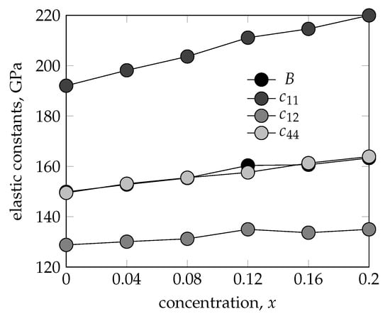 Figure 4 shows the calculated results of the bulk modulus and elastic constants for different types of Co content. The elastic constants are seen to increase with the Co content. This is consistent with the reduction in the lattice constant with increasing Co content. However, the change is very small. The traditional mechanical stability conditions for cubic crystals , and are satisfied throughout the entire concentration range. In particular, the constant increases with Co content, a trend also observed in the CrMnNi alloy [7]. Both and remain positive, and the Cauchy pressure is negative for all alloys considered, becoming more negative as the Co content increases at room temperature. Negative Cauchy pressures have been associated with the covalent nature of the metallic bond and are characteristic of brittle alloys [73]. In general, the impact of the Co content on the mechanical properties is found to be relatively small.