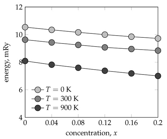 The calculated equilibrium Wigner–Seitz radius, (in a.u.), of the alloy for different concentrations (atomic fractions) x. The equilibrium radii were calculated in the PM state (0 K, 300 K, and 900 K). Note that is directly proportional to the lattice parameter.
