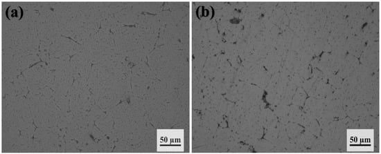 Figure 6 shows the metallographic images of the alloy after aging treatment at 120 °C. Comparing Figure 4a with Figure 6a, it can be observed that the eutectic structures in the alloy without pre-deformation are significantly decreased. Similarly, a comparison between Figure 4b and Figure 6b reveals that there is no significant grain growth observed in the alloy after the aging treatment. This suggests that the aging process at this temperature primarily affects the eutectic structures without substantially altering the grain size.