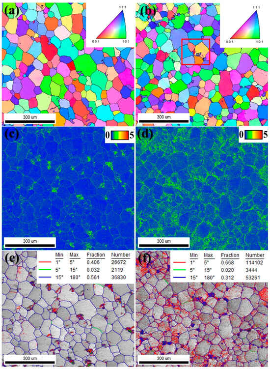 Figure 3 presents the EBSD images of the alloy without and with pre-deformation, where Figure 3a,b are inverse pole figure (IPF) maps indicating different crystal orientations by various colors. Figure 3a,b show inverse pole figure (IPF) maps, where different crystal orientations are indicated by various colors. In the alloy without pre-deformation, the grain colors are relatively uniform, while the alloy with pre-deformation exhibits more variation in color within the grains, marked by the red square, indicating small orientation variations. Figure 3c,d show the local kernel average misorientation (KAM) maps corresponding to Figure 3a,b. Notably, the alloy with pre-deformation exhibits localized bright areas in both small and large grains, indicating residual stresses due to grain growth during solidification. The bright areas, mainly located near grain boundaries, suggest that pre-deformation caused dislocation slip, with dislocations accumulating at grain boundaries. Figure 3e,f represent the grain boundary (GB) maps corresponding to Figure 3a,b, where the red and green lines represent small-angle grain boundaries, while the blue lines represent large-angle grain boundaries. From Figure 3e,f, it can be observed that the proportion of small-angle grain boundaries in the range of 1–5° is increased from 40% to 66% by pre-deformation, while the proportion of high-angle grain boundaries in the range of 15–180° is decreased from 56% to 31%.