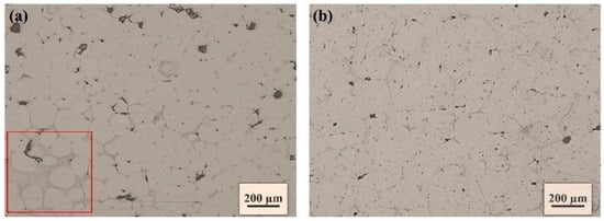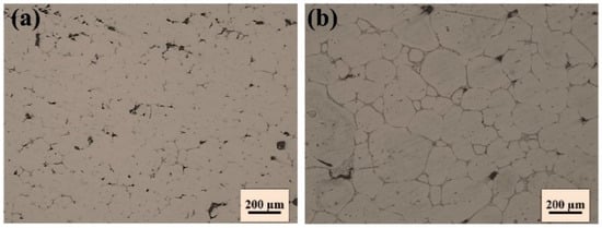 Figure 2 shows the metallographic microstructures of the spray-formed aluminum alloy without and with pre-deformation. In the images, the solid solution is represented by light-grey areas, while the black regions along the grain boundaries indicate the eutectic structures formed during solidification. The dark-grey points within the grains represent secondary phases and etching pits. By comparing Figure 2a,b, it can be observed that the pre-deformation with a reduction of 5% did not cause significant changes in the microstructure of the alloy.