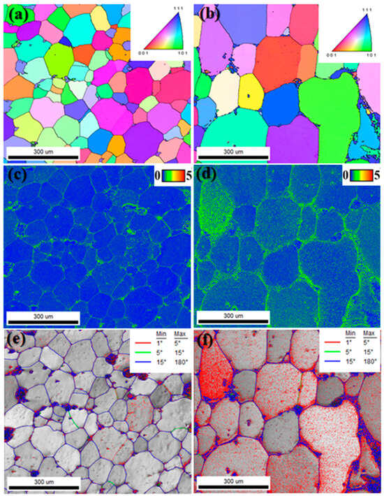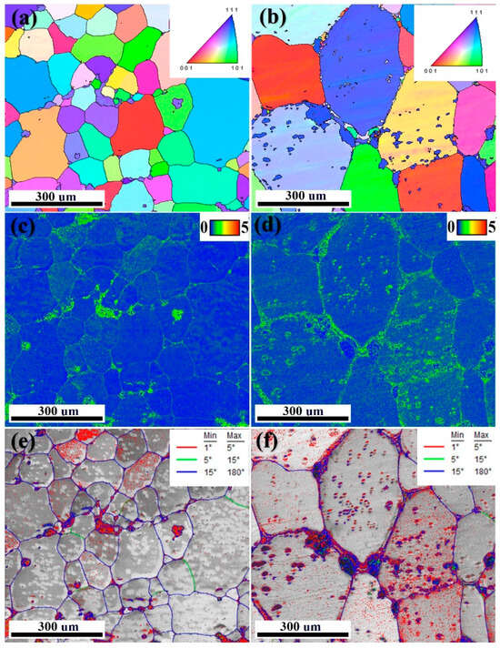 EBSD images of the 7xxx series aluminum alloy without and with pre-deformation: (a) IPF map without pre-deformation; (b) IPF map with pre-deformation; (c) KAM map without pre-deformation; (d) KAM map with pre-deformation; (e) GB map without pre-deformation; (f) GB map with pre-deformation.
