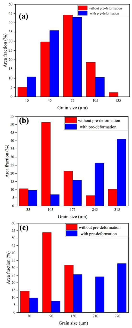 To intuitively compare the evolution of grain sizes, a statistical analysis of grain sizes in different states was conducted, and the results are shown in Figure 8. The values for the alloy without pre-deformation are marked in red, while those for the alloy with pre-deformation are marked in blue. Figure 8a shows the grain size distribution of the alloy before heat treatment. The grain size distribution of the alloy does not change much by pre-deformation, which is due to the small thickness reduction during pre-deformation. Figure 2 shows the corresponding SEM image of the alloy before heat treatment, where the grain structure is still relatively coarse and uniform across both groups. Figure 8b shows the grain size distribution of the alloy after holding at 580 °C. Compared to Figure 8a, the grain size is significantly increased and distributed in the range between 35 µm to 315 µm. After pre-deformation, the proportion of grains in larger size is higher, as seen in the SEM image (Figure 4), which indicates more pronounced coarsening of the grain structure due to the elevated temperature and time at 580 °C. Figure 7c shows the grain size distribution of the alloy after aging treatment. The grain size of the alloy without pre-deformation is distributed in the range between 30 µm to 150 µm, while that of the alloy with pre-deformation is distributed in the range between 30 µm to 270 µm; both are relatively smaller than that after holding at 580 °C. The corresponding SEM image in Figure 6 illustrates the finer grain structure after aging, with more uniform precipitate distribution and smaller grain sizes than those observed after the solution heat treatment.