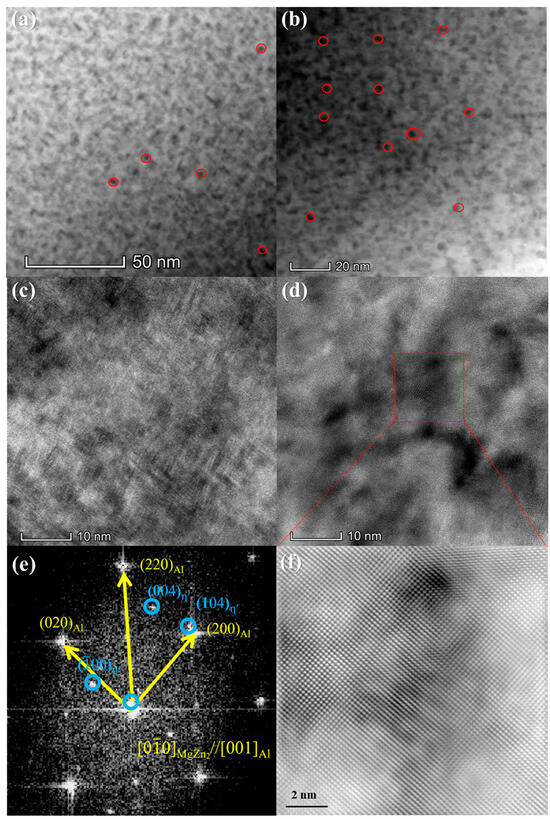 TEM images of 7xxx series aluminum alloy BF without pre-deformation after aging: (a) BF image without pre-deformation; (b) BF image with pre-deformation; (c) HRTEM without pre-deformation; (d) HRTEM with pre-deformation; (e) FFT of (d); (f) inverse FFT imaged.