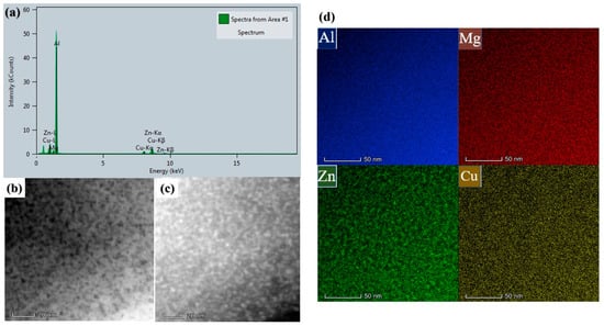 Elemental distribution of 7xxx series aluminum alloy: (a) main elements; (b) BF image; (c) DF image; (d) elementary distribution corresponding to (b).