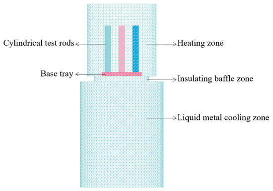 For higher computational efficiency, the model was simplified to encompass three primary regions: a heating zone, an intermediate insulating baffle zone, and a liquid metal cooling zone. The cylindrical test rods were positioned on a base tray made of molybdenum alloy. For the purposes of this study, the influence of the drawing device was treated as negligible and thus excluded from the model, as shown in Figure 1. Through this streamlined approach, a focused analysis was conducted on the thermal dynamics within the critical zones of the directional solidification process.