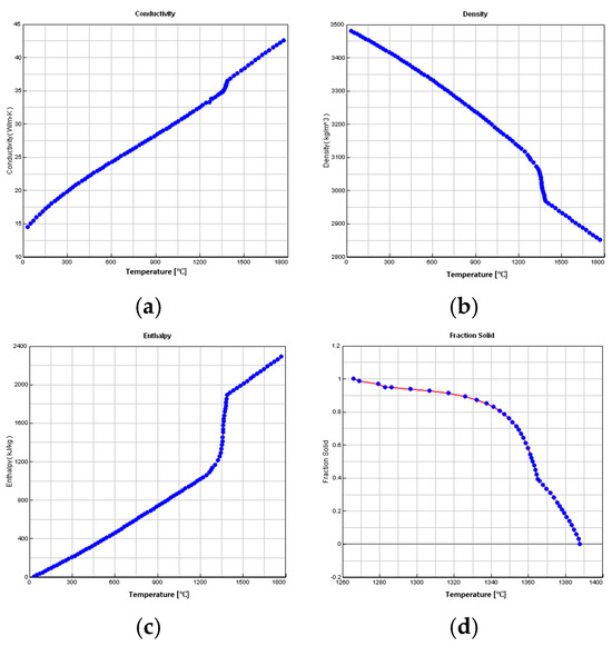 Thermal Properties of Ti-48Al-2Cr-2Nb Material. (a) Thermal Conductivity. (b) Density. (c) Enthalpy. (d) Solid Fraction.