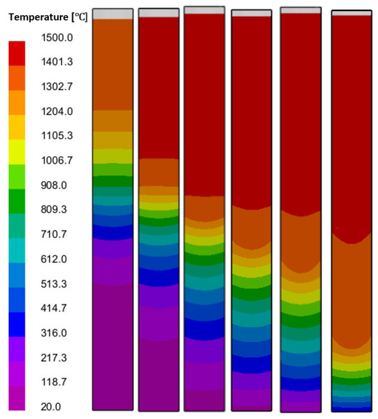 Figure 3 illustrates the temperature distribution within the test rods as they reach an equivalent position within the liquid metal cooling zone at different drawing speeds. Notably, there is a significant thermal gradient observed in the intermediate baffle area, which represents a critical region for heat exchange during the solidification process.