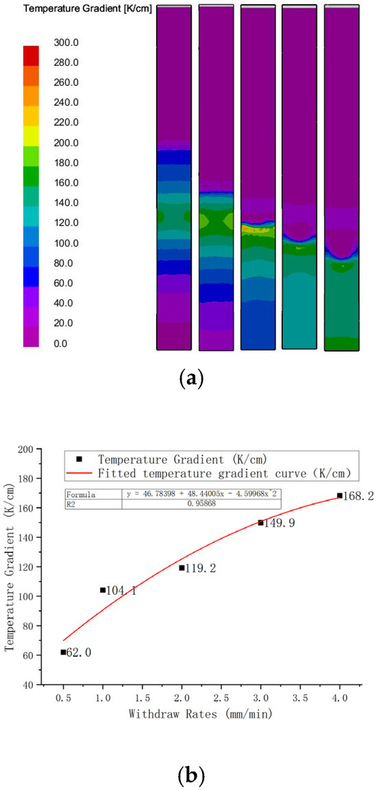 Temperature gradient distribution at Different Drawing Speeds. (a) Contour map of temperature gradient distribution. (b)Temperature gradient at the solid–liquid interface.