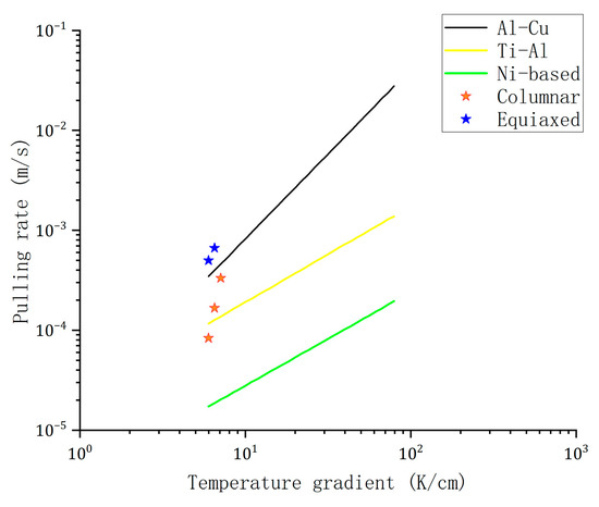 Figure 7 presents the CET (columnar-to-equiaxed transition) diagrams established for different alloy systems, where the CET line in the log(V)-log(G) coordinate system demarcates the equiaxed grain region (above the line) from the columnar grain zone (below the line). In this study, five sets of simulation experiments were conducted with limited data volume. Nevertheless, emerging trends from the existing data demonstrate that, under a specified temperature gradient, the critical withdrawal rate required to trigger CET transition in Ti-48Al-2Cr-2Nb surpasses those of both Ti-46Al-8Nb alloy and conventional superalloys, while approaching the values characteristic of the Al-Cu alloy system.