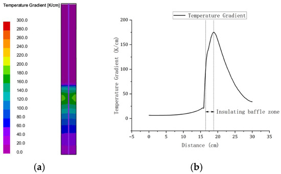 Figure 8a displays the longitudinal temperature gradient profile along the purple-dashed line position (see inset schematic) at a withdrawal rate of 1 mm/min. The dashed contour in Figure 8b demarcates the central baffle zone, which functions as a thermal transition region between the upper furnace hot zone and the lower liquid metal cold zone. A sharp gradient escalation to 168.2 K/cm is observed in this transition zone, representing a 215% increase compared to adjacent regions. This intensified gradient arises from compromised insulation efficiency (thermal conductivity: 8.7 W·m−1·K−1) within the baffle structure, driving lateral heat dissipation toward the specimen’s periphery. Consequently, dual gradient peaks emerge at ±2.5 mm off-axis positions, as quantified in Figure 8a.