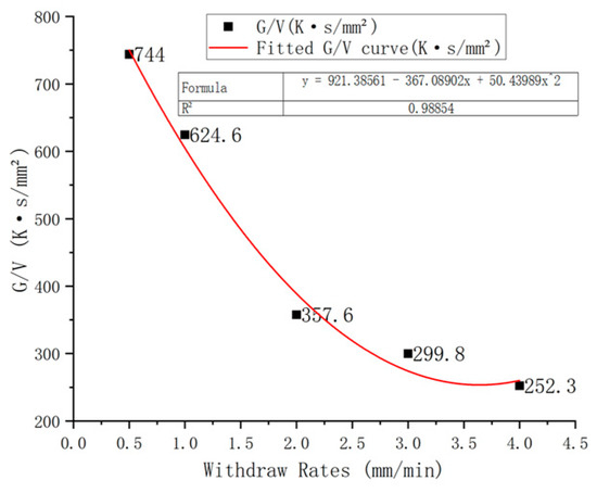 The ratio of the temperature gradient to the solidification rate, G/V, serves as a critical parameter in determining the morphology of the solidification interface [23]. As shown in Figure 9, the G/V ratio (temperature gradient to growth velocity ratio) decreases with increasing withdrawal rate. Combined with the solid–liquid interface analysis in Section 2.1, the critical G/V value for Ti–Al alloys is determined to be 624.6 K·s/mm2. Below this threshold, the solid–liquid interface becomes unstable, transitioning from planar to non-planar morphology due to constitutional undercooling and breakdown of interfacial stability. This critical value serves as a key parameter for optimizing directional solidification processes to maintain planar solid–liquid interfaces.