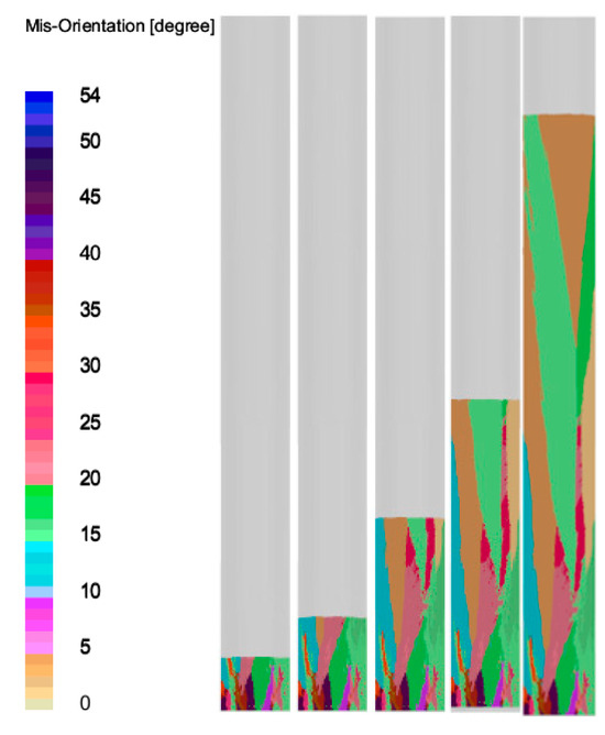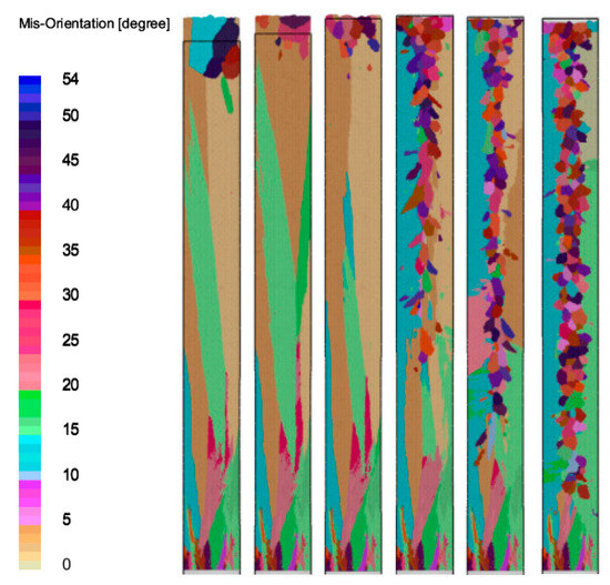 Figure 10 presents a microstructural simulation of the test rod, with various grain orientations indicated by distinct colors. At the onset of solidification, a rapid cooling rate is achieved at the bottom of the test rod, which is in contact with the chill plate. This rapid cooling facilitates a prolific nucleation event at the base of the rod. As the drawing speed rises incrementally to 3 mm/min, equiaxed crystals emerge at the core of the test rod, suggesting the change in nucleation behavior.