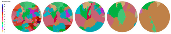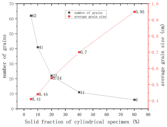 For the most stable solid–liquid interface, an in-depth analysis was conducted of the grain distribution across the cross-section of the test rod at a drawing speed of 1 mm/min and varying solid fractions of 5%, 10%, 20%, 40%, and 80%, as shown in Figure 11, Figure 12 and Figure 13. As can be seen in Figure 11 and Figure 12, certain oriented grains are outcompeted and eliminated during the competitive growth phase as drawing proceeds. As shown in Figure 13, the number of grains in the cross-section of the test rod gradually decreases with the advancement of drawing, from an initial count of 62 to just 6. In the meantime, the average grain size increases significantly, from 0.41 cm to 0.95 cm, which implies a transition from an initial equiaxed crystal structure to a columnar crystal structure. This highlights the substantial effect of drawing speed on the microstructural evolution of the material.