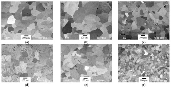 Figure 12 shows the microstructure study results of annealed alloys with different Mg, Sc, and Zr contents. The released Al3(Sc,Zr) particles provide the nonequilibrium UFG microstructure stabilization of the Al–Mg–Sc–Zr alloys. The onset temperature of the grain growth is weakly dependent on the Mg concentration and the Sc/Zr ratio. Large recrystallized grains were observed in the alloys with a high Zr content and a low Mg content (2.5, 4%) (Figure 12b,d). The recrystallized microstructure in the annealed alloys with 6% Mg had a high degree of homogeneity after heating to 500 °C (Figure 12e,f).