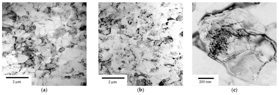 The UFG alloys with 2.5% Mg after ECAP had a homogeneous microstructure with an average grain size of 0.6–0.8 μm. Increasing the Mg concentration from 2.5 to 6% led to a slight decrease in the average grain size to 0.3–0.5 μm (Figure 9). Changing the Sc/Zr ratio has no significant effect on the microstructure of the UFG alloys. Analysis of the results of electron microscopy indicates that the UFG alloys contain a substantial proportion of HAGBs. The grains have an increased density of lattice dislocations (Figure 9c). In some grains, high dislocation density was observable (Figure 9d), but their number is small. All the alloys contain single Al3(Sc,Zr) nanoparticles (Figure 9e,f), which were obviously formed at warm ECAP (TECAP = 250–275 °C). The Al3(Sc,Zr) nanoparticles are uniformly distributed and present both in the bulk of the grains and at GBs (Figure 9e).