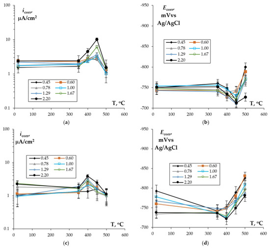 The corrosion current density icorr (µA·cm−2) and the corrosion potential Ecorr (mV vs. Ag/AgCl) were calculated based on the analysis of the slope in the Tafel curves (the ration of potential E to current density i on the semi-logarithmic axes lg(i)–E). The ES8 software developed by Elin Co. (Moscow, Russia) was used for the result analysis. The mean uncertainty in the Ecorr determination was 5 mV and was limited by the reproducibility of the results. The mean uncertainty in the icorr determination was close to 0.1–0.15 mA.