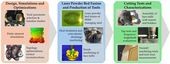 This study follows the research outline in Figure 3, starting with the selection of a commercially available indexable face mill, followed by preliminary finite element analysis (FEA) to assess the tool’s initial state. After topology optimizations based on initial FEA, distinct tool designs were produced from M300 maraging steel powder by PBF-LB AM and heat treated in accordance with the material’s specification. Wire electric discharge machining (WEDM) was then used to separate the face mills from the PBF-LB base plates, and their assembly surfaces, such as the screw holes or insert seatings, were finish machined. The face mills were then mounted to spindle extension arbors and adaptors for tap tests. Lastly, cutting trials on wrought Ti6Al4V were carried out using a fixed set of cutting parameters.
